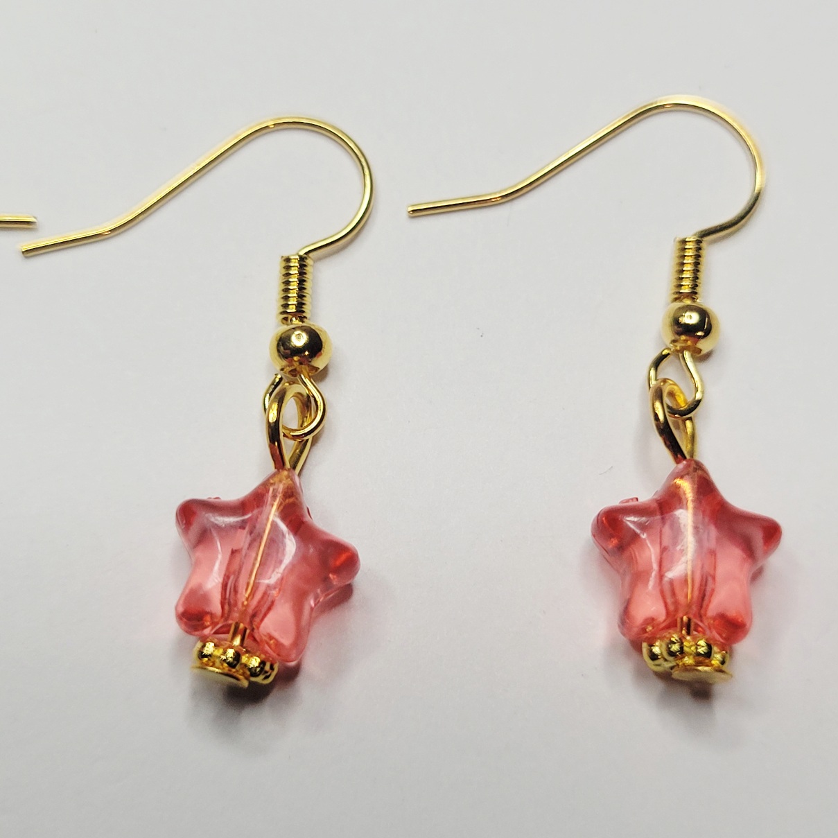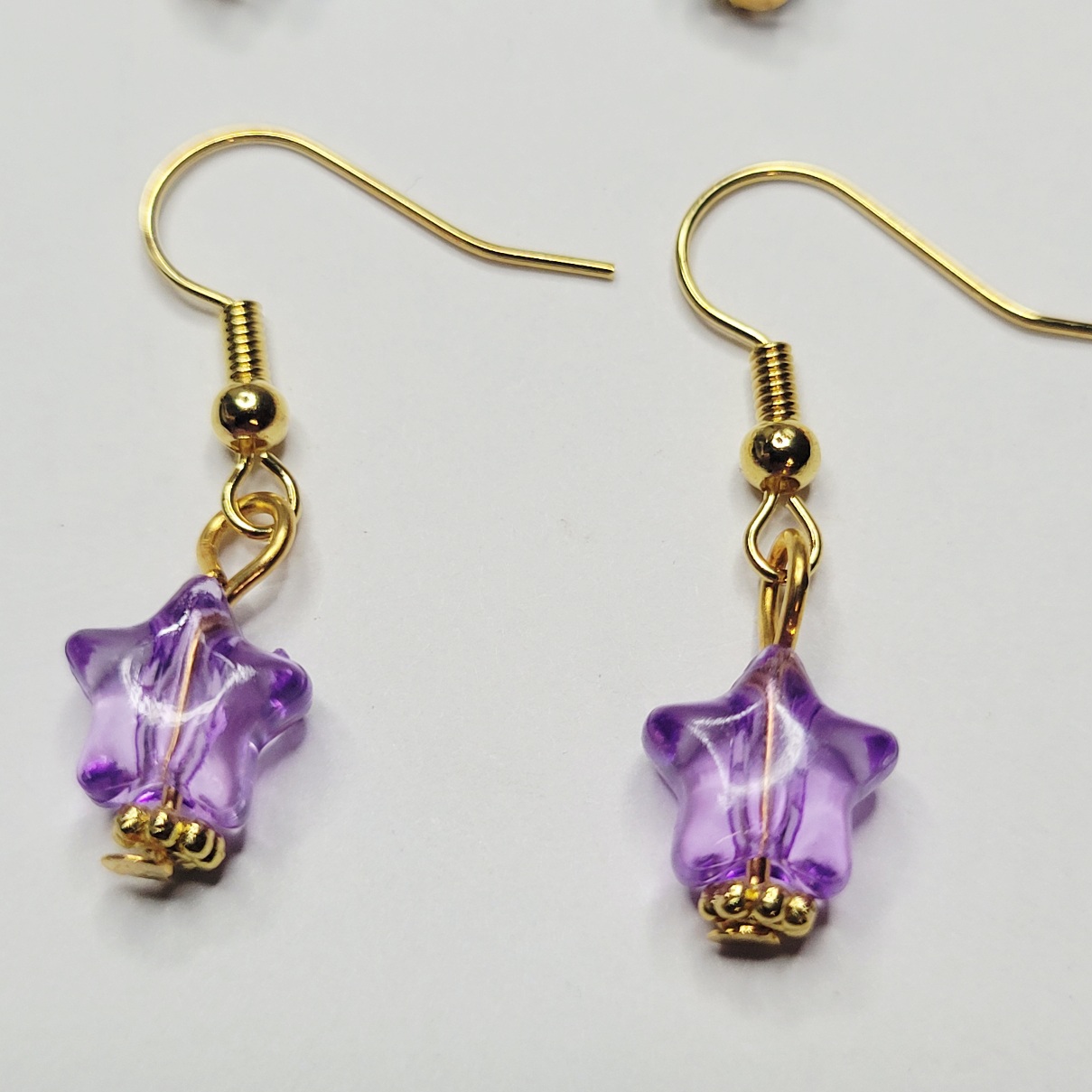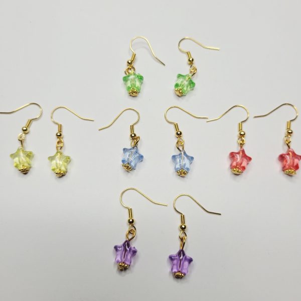 What a great deal! FIVE pairs of matching acrylic star earrings in multiple colors all in one purchase! Gold color earring hooks and the earrings, as shown, are pinkish, purple, blue, green, yellow! Hypoallergenic of course! Please note, this set is NOT carded, they are all bagged together.