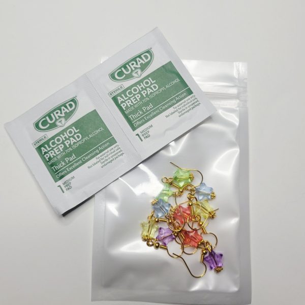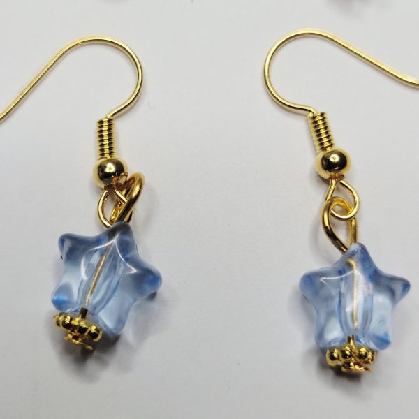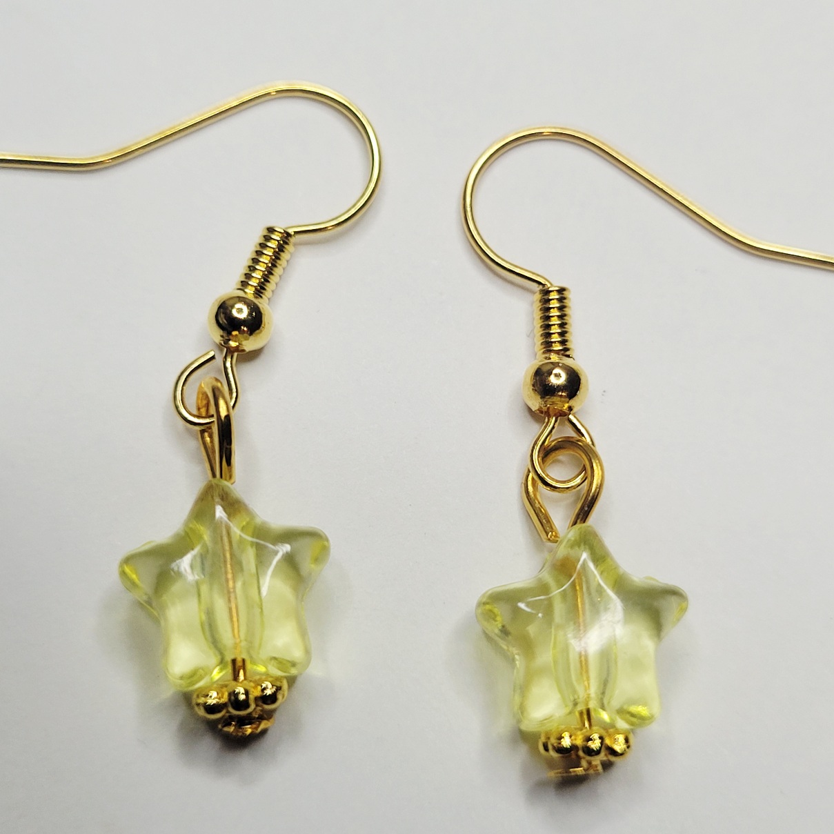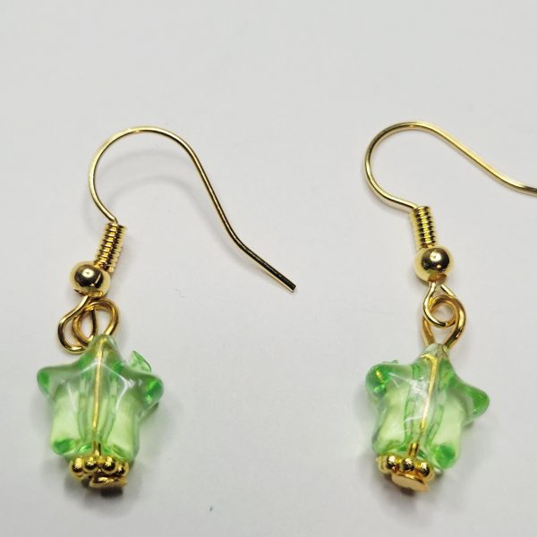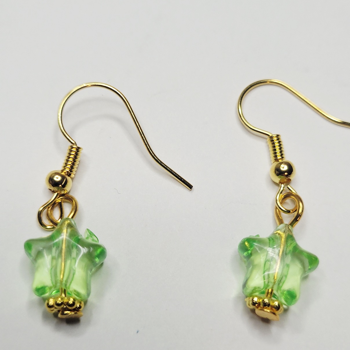 What a great deal! FIVE pairs of matching acrylic star earrings in multiple colors all in one purchase! Gold color earring hooks and the earrings, as shown, are pinkish, purple, blue, green, yellow! Hypoallergenic of course! Please note, this set is NOT carded, they are all bagged together.