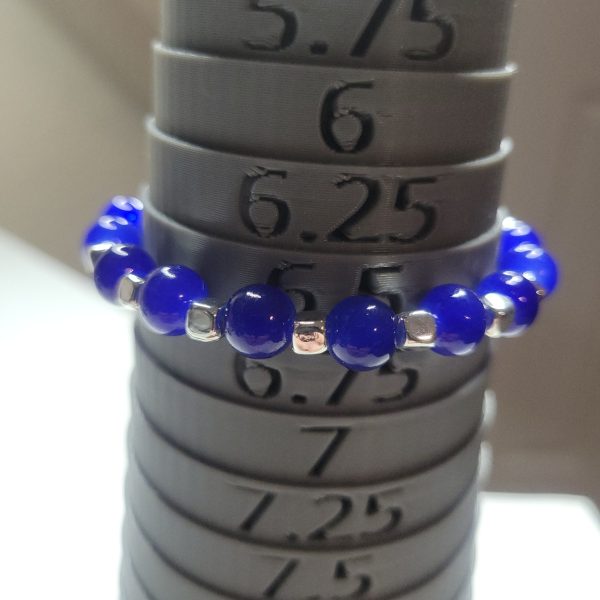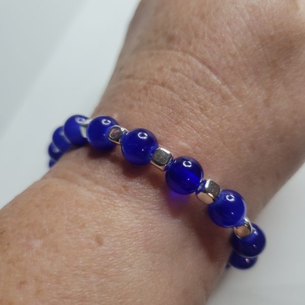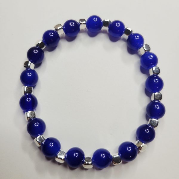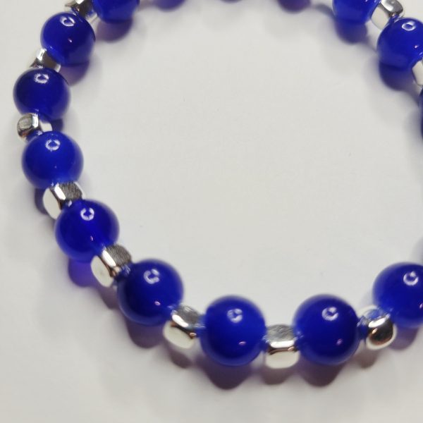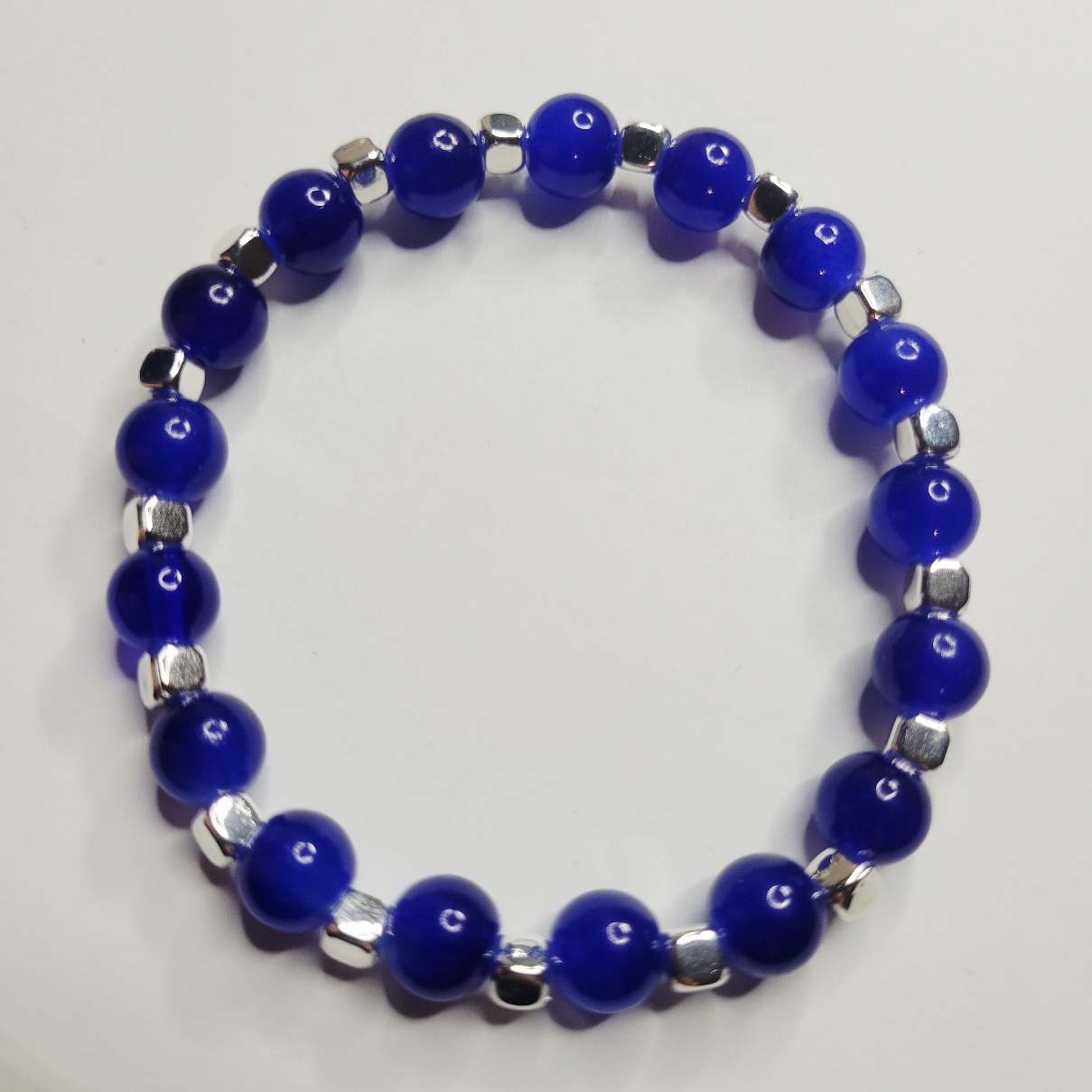 The most amazing blue color you have ever seen – cobalt! We have paired these semitranslucent cobalt blue 8mm glass beads with super sparkly silver color accent pieces and then put them all on a super stretchy bracelet cord – easy on and off! This blue reminds me of the Noxema blue or the Nivea blue.