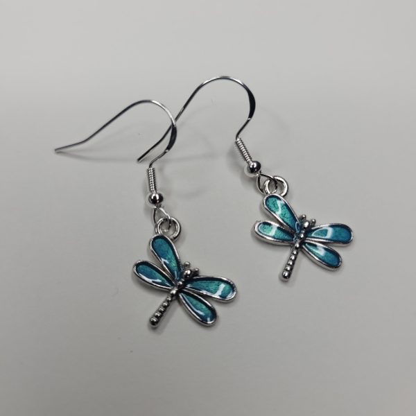 Adorable blue enameled dragonfly earrings with hypoallergenic, sterling silver hooks. Matching pieces available! Same day shipping.