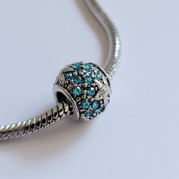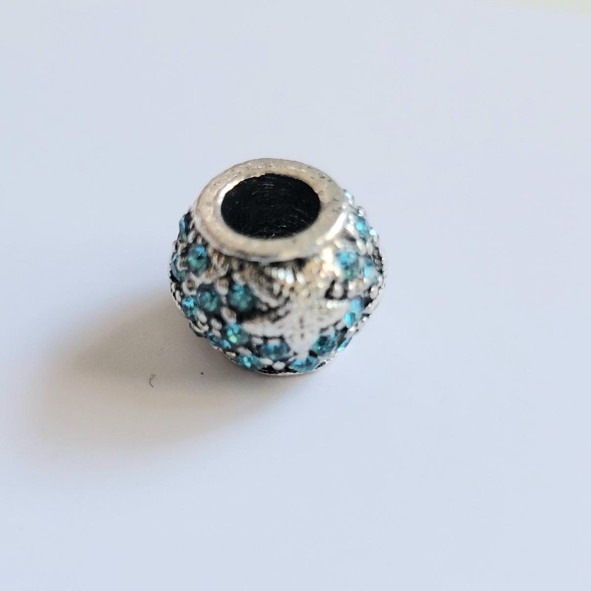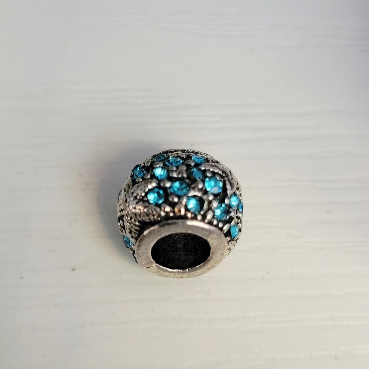 This good size, round metal, luminescent (glowing) blue rhinestone crystals on a bright silver colored charm is absolutely gorgeous and it has a nice rich weight to it. Compatible with Pandora, Troll and other European style bracelets! This sale is for one charm only. It does not include the bracelet. It is not Pandora brand.