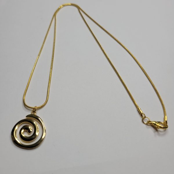 Nice and shiny gold color swirl pendant on a gold color 22 inch snake chain necklace. Same day shipping. Matching earrings available!