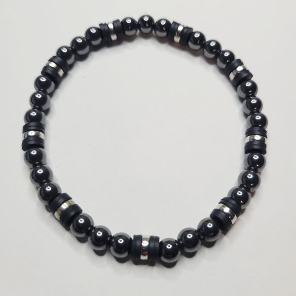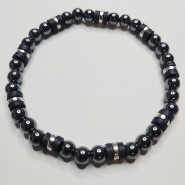 Classy men’s hematite stone bracelet with a natural mirror like finish accented with silver color spacers and black clay heishi spacers. Size is 7.5 inches before stretching. Has a really nice, solid feel! Makes a great gift.