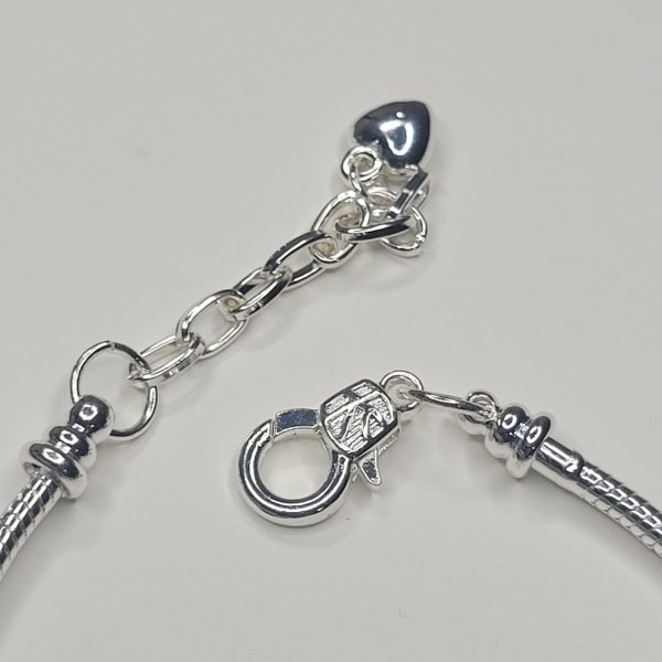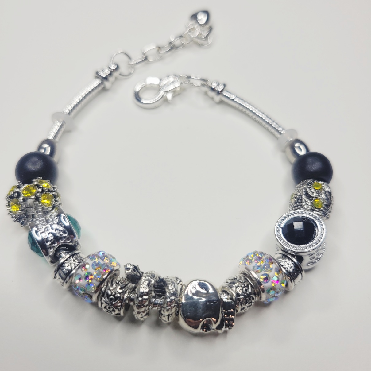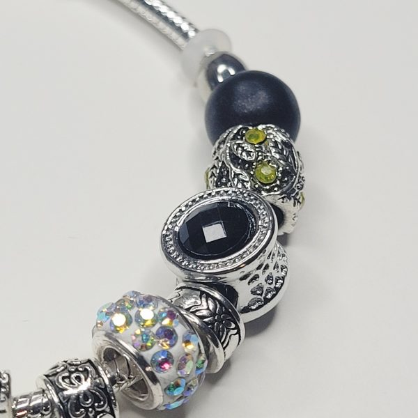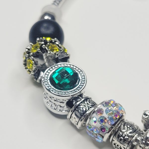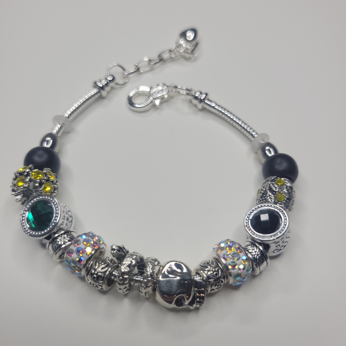 Here’s something you don’t see every day! Our newest Pandora compatible bracelet on a bright silver color adjustable snake chain with an extender comes with black and green gem barrel charms, a heavy duty skull charm, a snake or serpent charm, rhinestone studded european beads, and more! One end is removable so you can add and remove or rearrange charms! So unique, interesting and NICE quality. Comes in a tarnish free pouch with a polishing cloth!