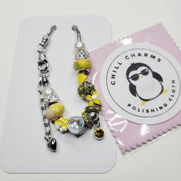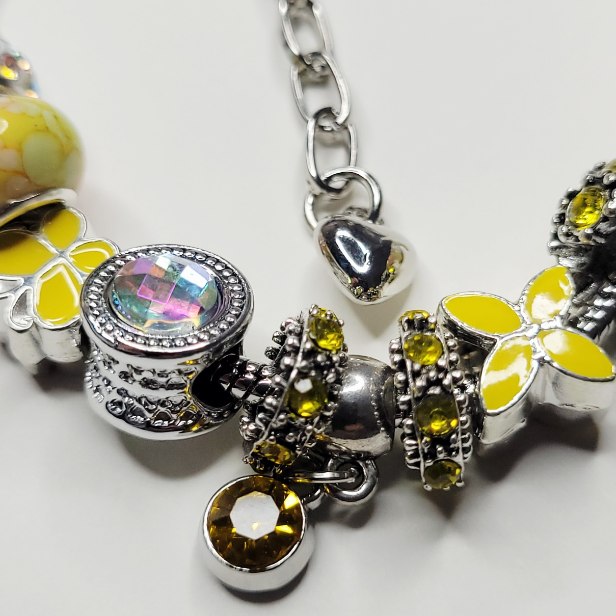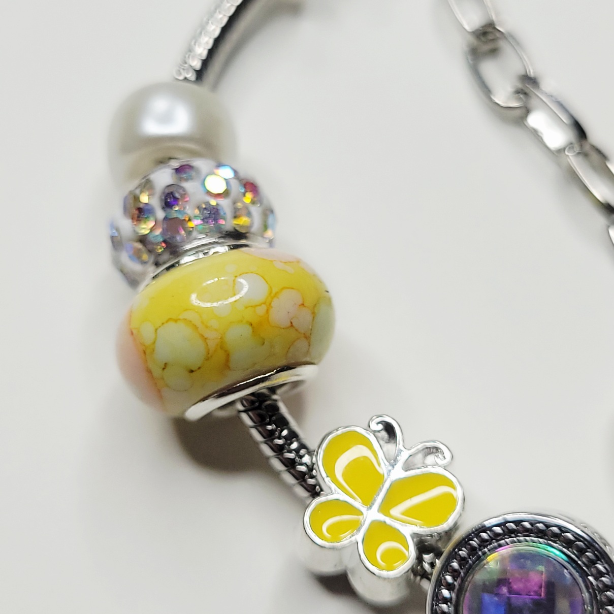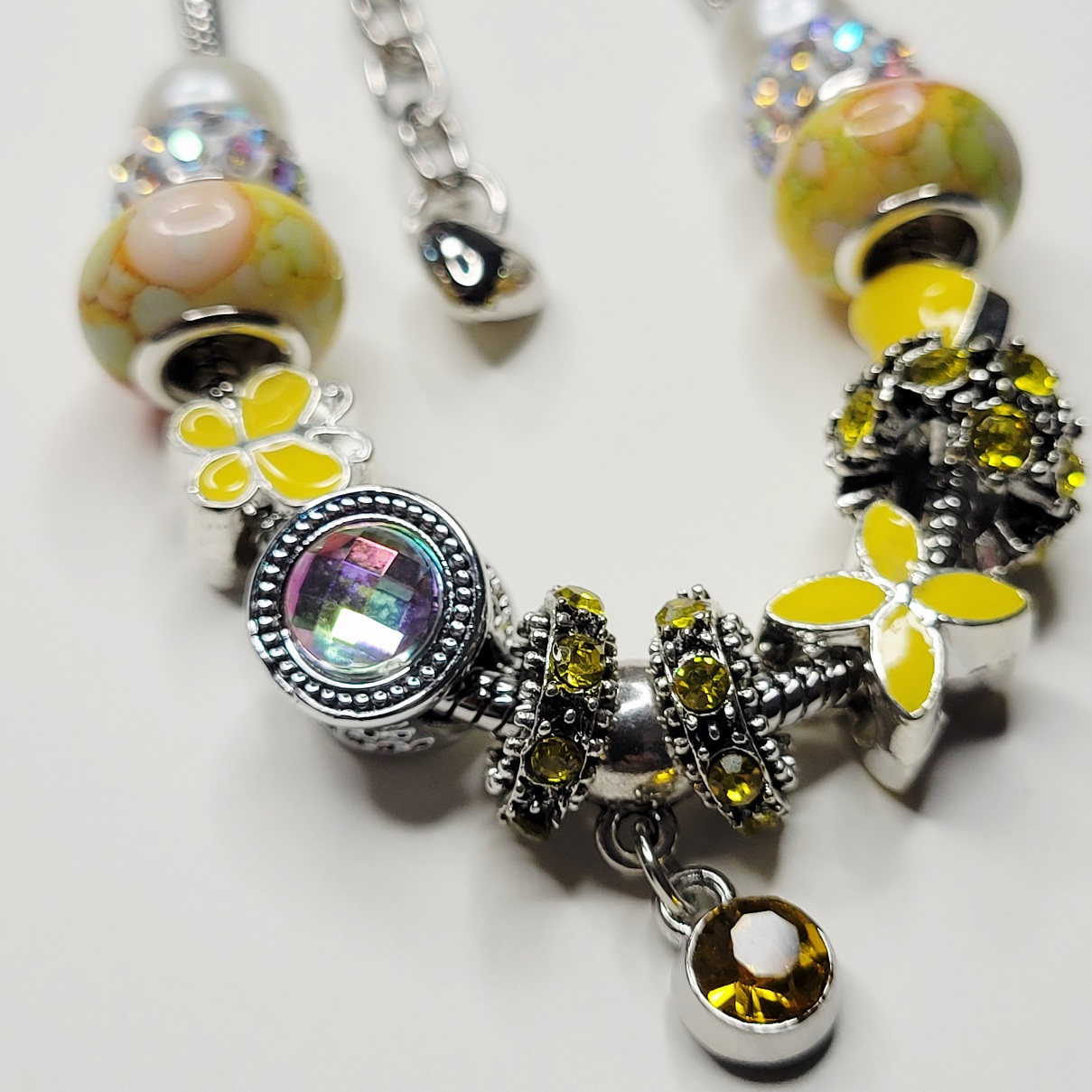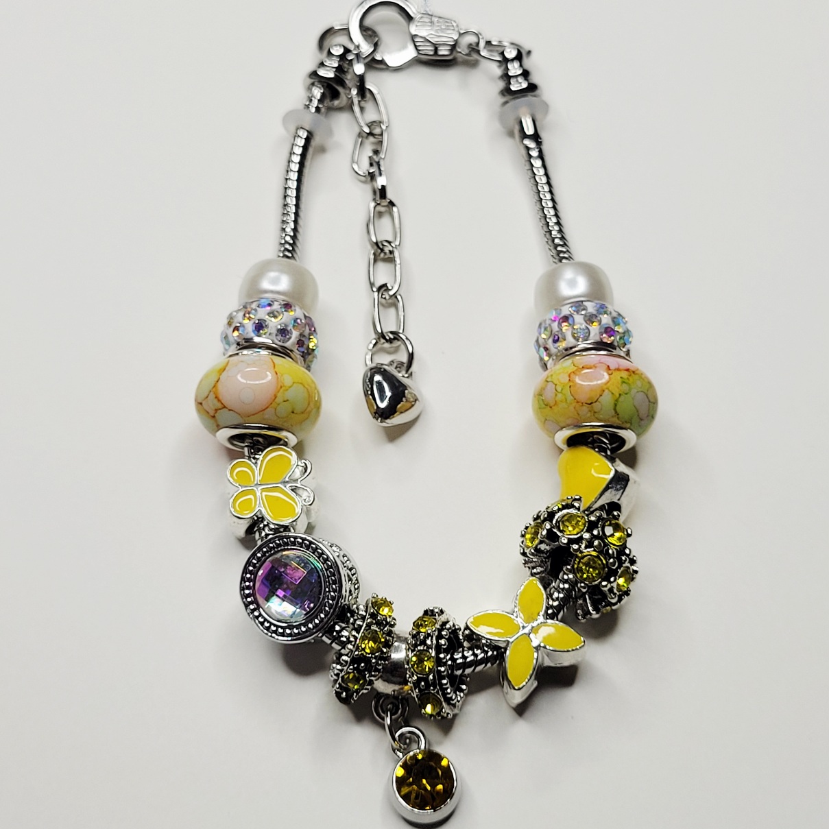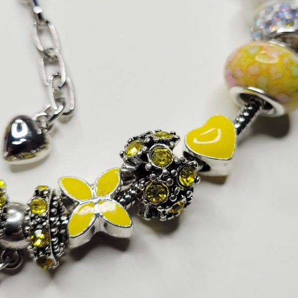 Exclusive Summer Sunshine Pandora style (not Pandora brand) charm bracelet! Size is about 6.75 on the small end, adjustable to around 8 inches. This shiny new Pandora style snake chain bracelet is so bright, so happy, so sweet and so sunny with its cute yellow heart charm, the yellow butterfly, the numerous metal spacer charms, the two yellow hued European charm beads, the large AB barrel charm, and everything else! One end is removable so you can add or remove or even rearrange charms!