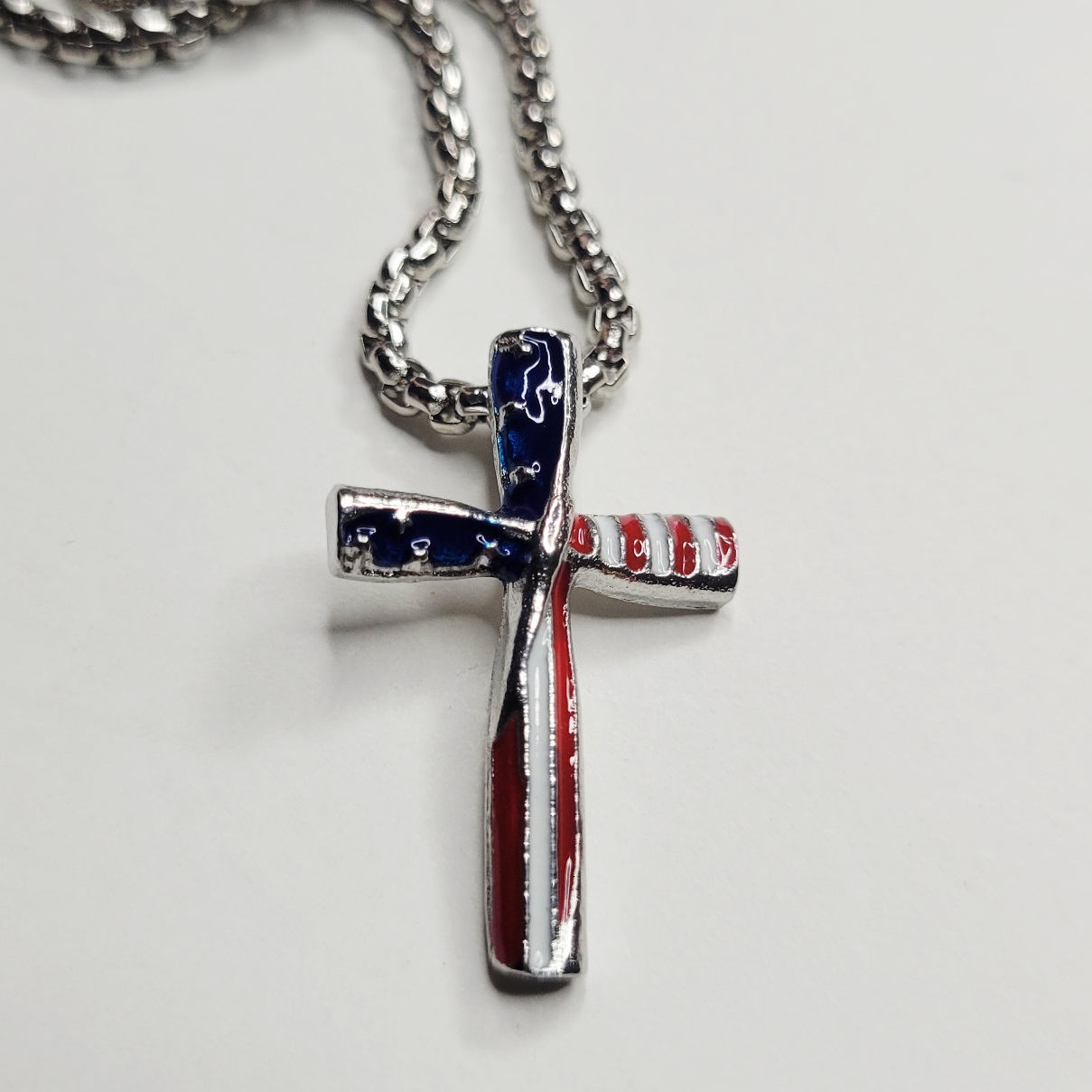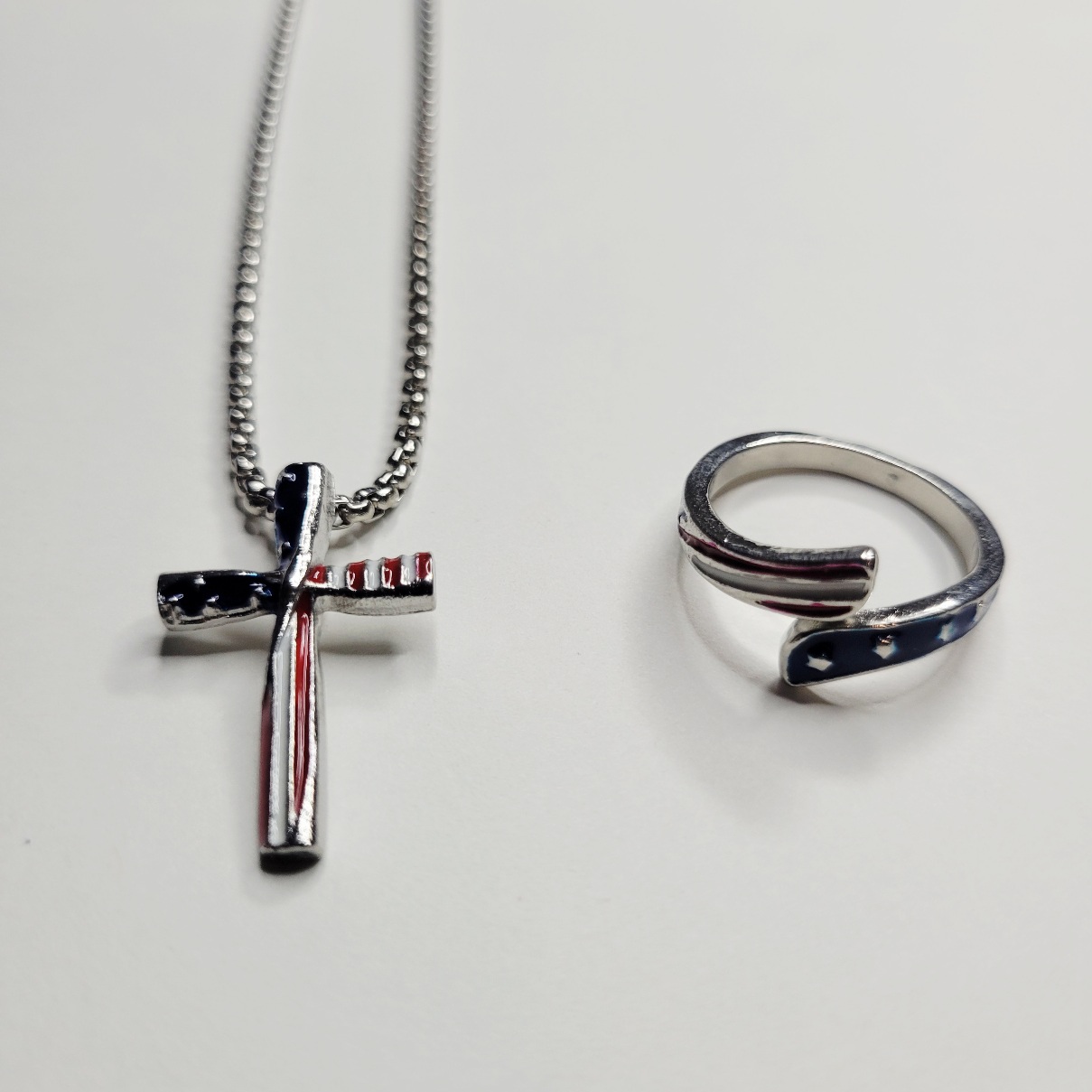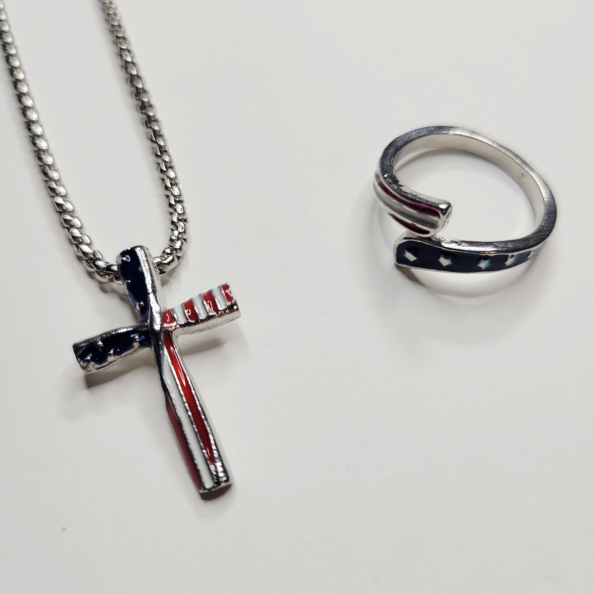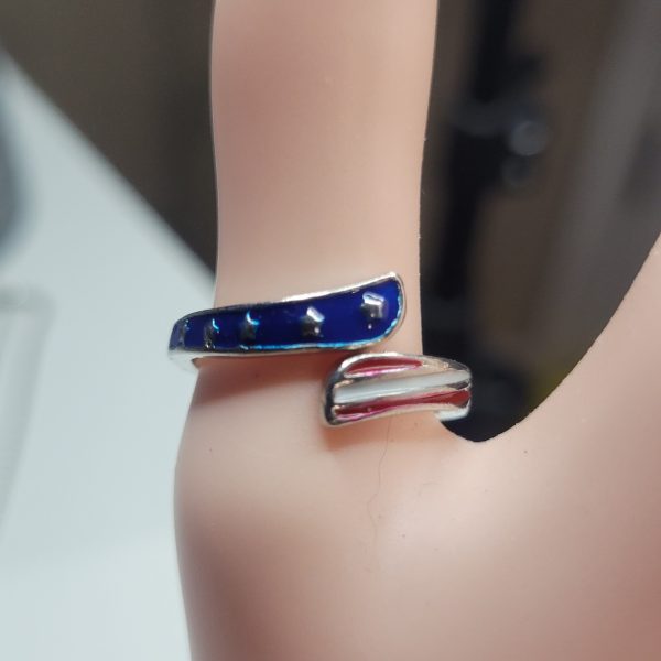 Bundle deal! Really nice for the price! This patriotic, Americana red, white and blue American flag style necklace and adjustable ring set is very vivid and beautiful! The ring is not chintzy, it is nice and solid. Adult sized, not for children. Same day shipping!