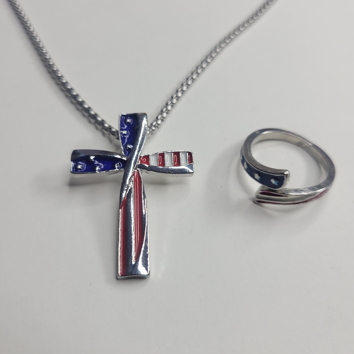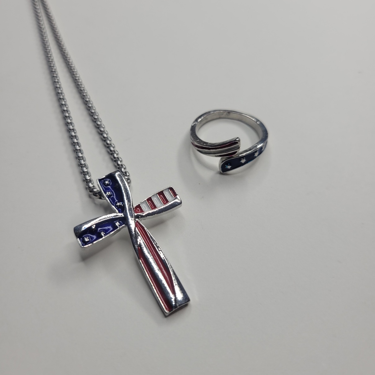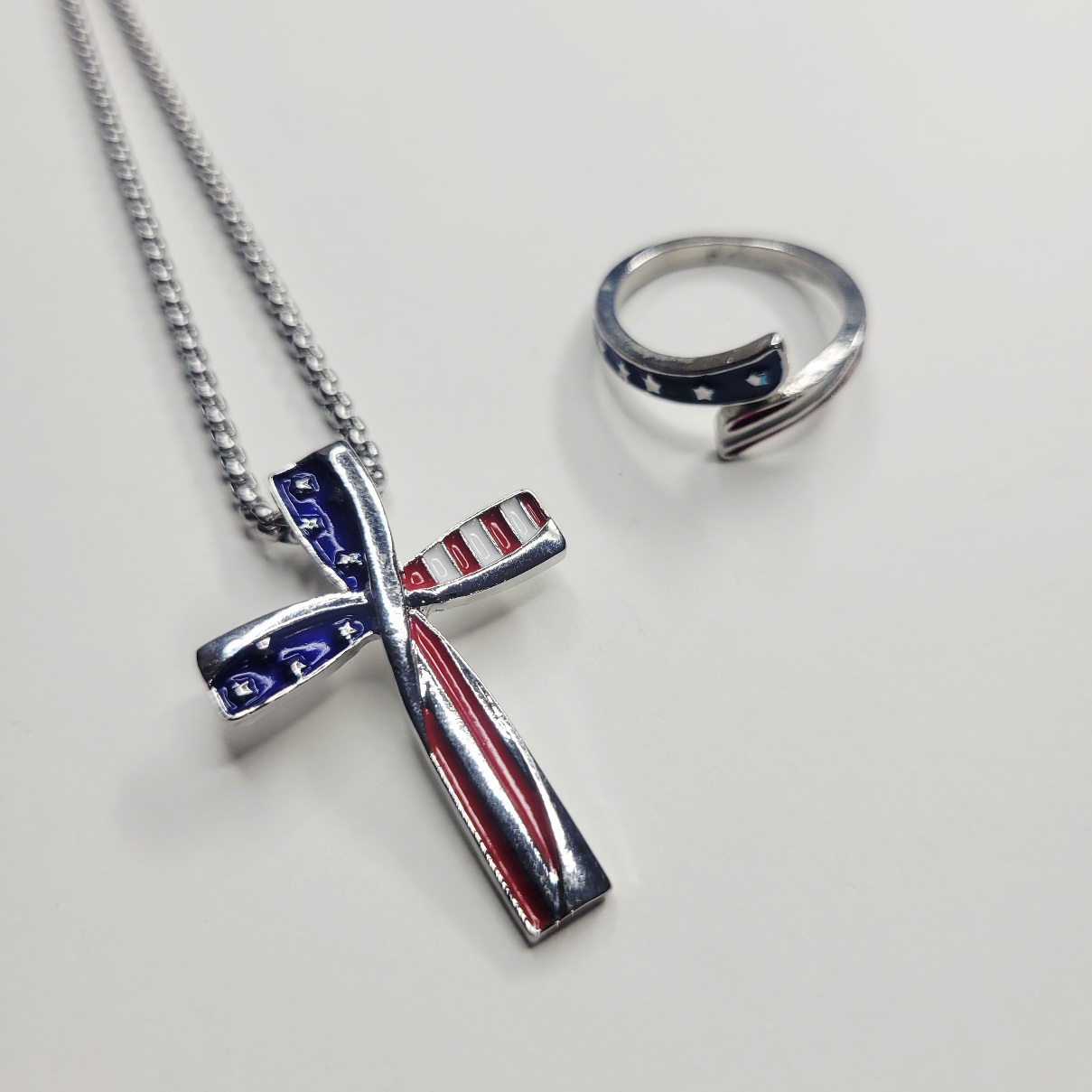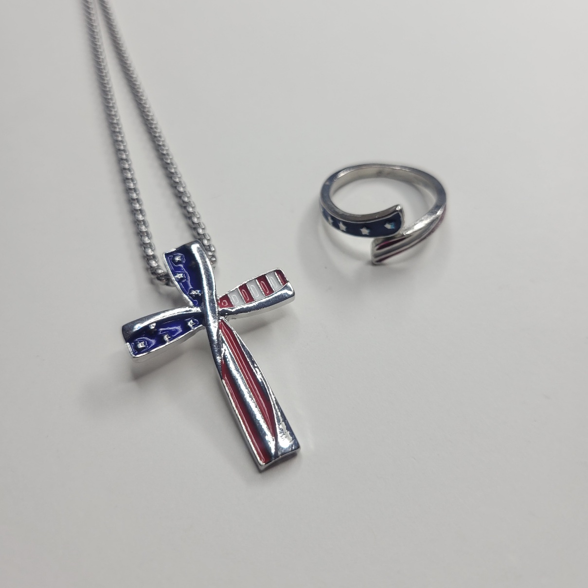 Bundle deal! Really nice for the price! This patriotic, Americana red, white and blue American flag style 22 inch necklace and adjustable ring set is very vivid and beautiful! The ring is adjustable and is nice and solid for the price. Adult sized, not for children. Same day shipping!