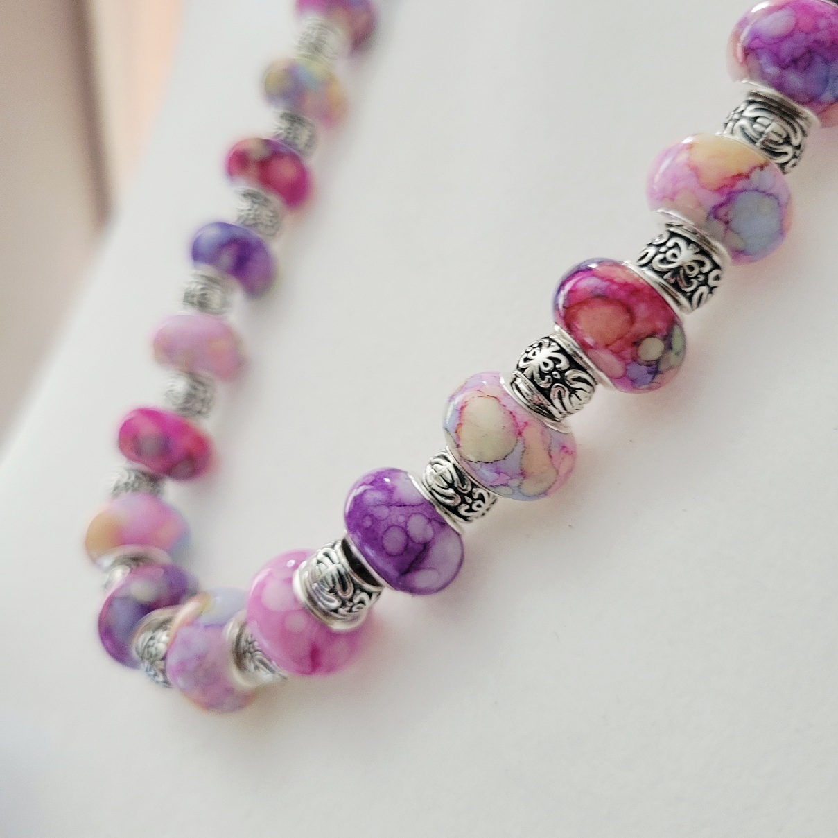 Ever been on the beach in Miami right before sunrise? Embrace the magic with the Pink Twilight European Bead Necklace from Chill Charms! This captivating piece showcases pink, purple, and multicolored European beads with swirling watercolor patterns, paired with ornate silvery spacers for a hint of shimmer. Placed on a stainless steel chain with a stainless toggle clasp for easy use, you can’t go wrong here. Inspired by the soft hues of a south Florida sunrise, it adds a mystical charm to your everyday look.