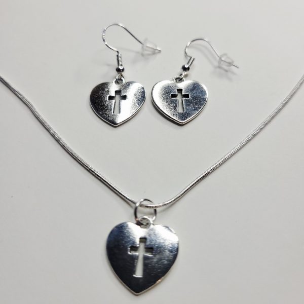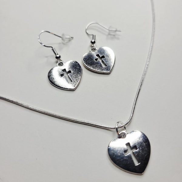 Cross Heart Charm Sterling Silver Necklace And Earrings Bundle