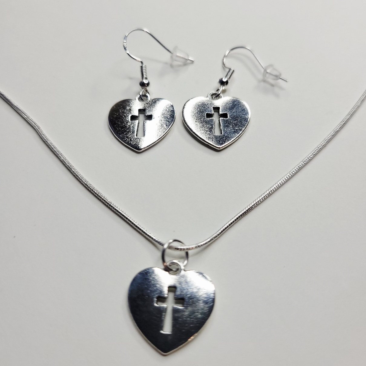Shiny bundle set, great for stocking stuffers! Includes a pair of cross heart earrings with sterling silver posts, and a 22 inch sterling silver snake chain necklace. Same day shipping.