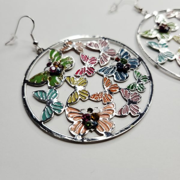 You will love these super cute and large metal hoop earrings which has multiple colors of butterflies, cut out butterfly in pink, green, blue, orange and more. Very bright and shiny! We replaced the earring setting with brand new 925 sterling silver hooks! Same day shipping!