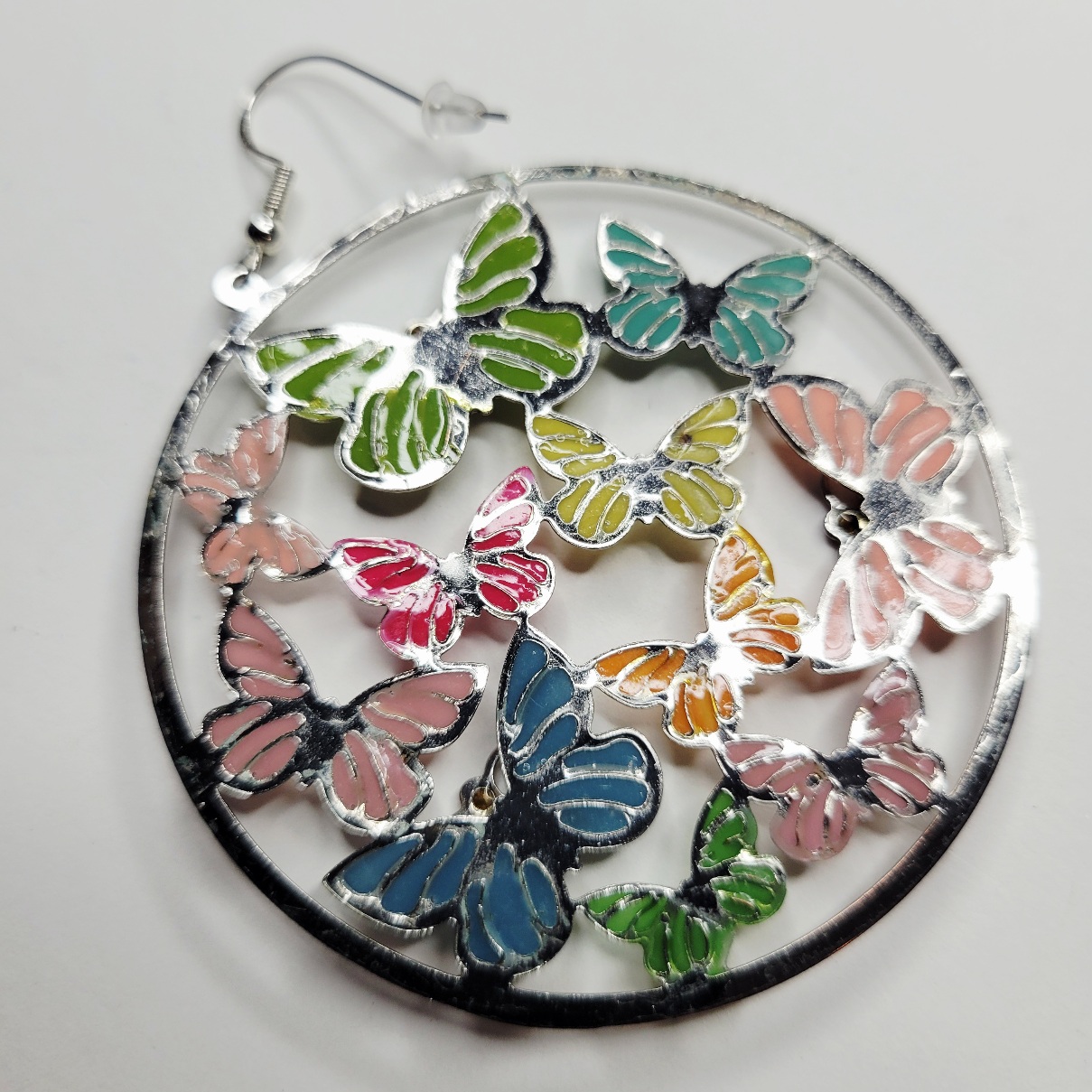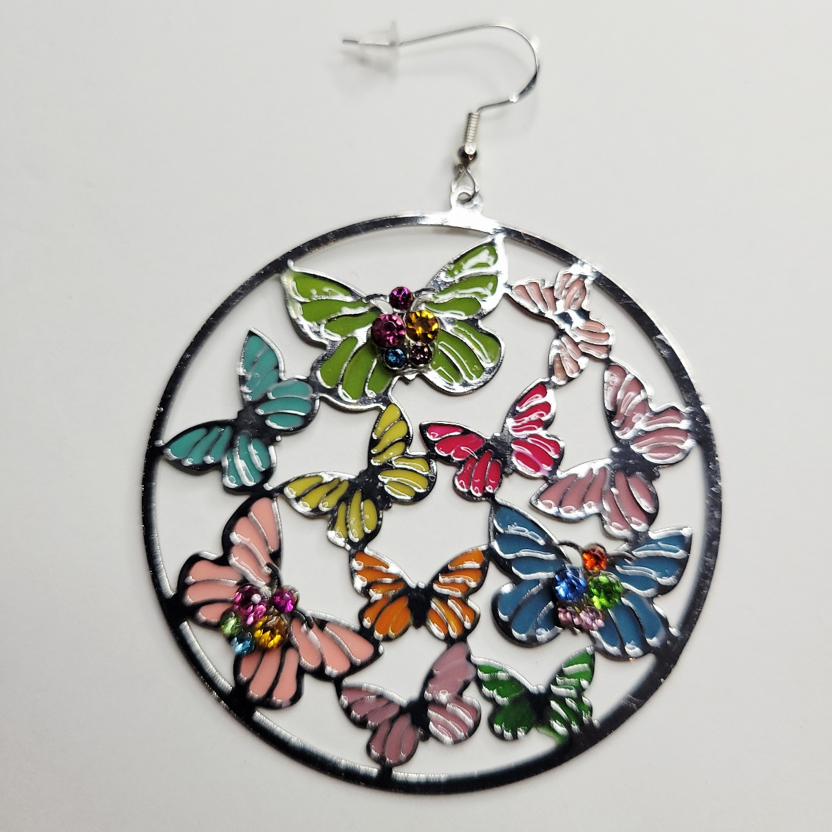 You will love these super cute and large metal hoop earrings which has multiple colors of butterflies, cut out butterfly in pink, green, blue, orange and more. Very bright and shiny! We replaced the earring setting with brand new 925 sterling silver hooks! Same day shipping!
